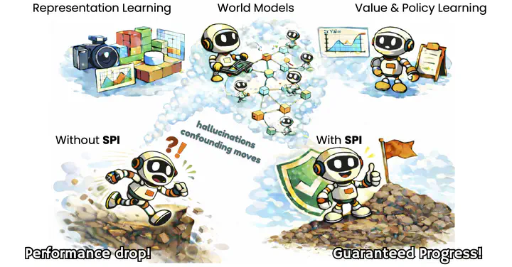 Safe policy improvement (SPI) offers theoretical control over policy updates, yet existing guarantees largely concern offline, tabular reinforcement learning (RL). We study SPI in general online settings, when combined with world model and representation learning. We develop a theoretical framework showing that restricting policy updates to a well-defined neighborhood of the current policy ensures monotonic improvement and convergence. This analysis links transition and reward prediction losses to representation quality, yielding online, “deep” analogues of classical SPI theorems from the offline RL literature. Building on these results, we introduce DeepSPI, a principled on-policy algorithm that couples local transition and reward losses with regularised policy updates. On the ALE-57 benchmark, DeepSPI matches or exceeds strong baselines, including PPO and DeepMDPs, while retaining theoretical guarantees.